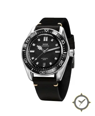 Eine Taucheruhr-Uhr mit einem 35mm Gehäuse im Vintage-Stil gefertigt aus Edelstahl mit einem Zifferblatt in schwarz und einer besonderen "subtle wavy/damascus-style texture"-Oberfläche.