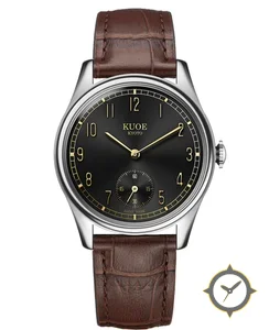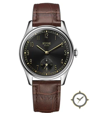 Eine Dress-Uhr mit einem 35.5mm Gehäuse im Vintage-Stil gefertigt aus Edelstahl mit einem Zifferblatt in schwarz und einer besonderen "sunburst"-Oberfläche.