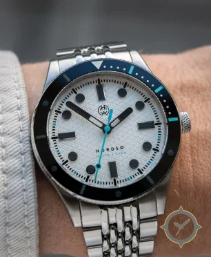 Eine Taucheruhr-Uhr mit einem markanten 49mm Auftritt am Handgelenk, gefertigt aus Edelstahl mit einem Zifferblatt in weiß und einer besonderen "textured triangular grid (micro-tessellated pattern)"-Oberfläche.