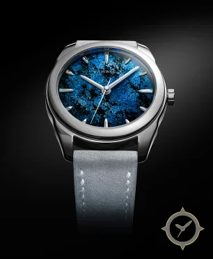 Eine Dress-Uhr mit einem 37.5mm Gehäuse im Vintage-Stil gefertigt aus Edelstahl mit einem Zifferblatt in blau und einer besonderen "meteorite-like textured/granular finish"-Oberfläche.