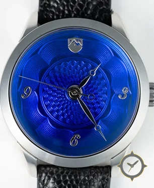 Eine Dress-Uhr mit einem markanten 42mm Auftritt am Handgelenk, gefertigt aus Edelstahl mit einem Zifferblatt in blau und einer besonderen "guilloché (engine-turned)"-Oberfläche.