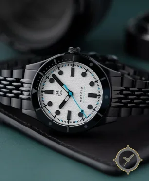 Eine Taucheruhr-Uhr mit einem vielseitigen 40.5mm Gehäuse, das an fast jedes Handgelenk passt, gefertigt aus Edelstahl mit einem Zifferblatt in weiß und einer besonderen "waffle / crosshatch texture"-Oberfläche.