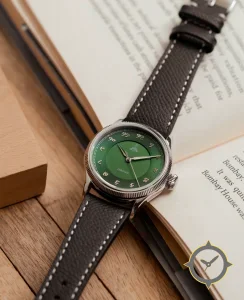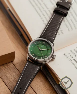 Eine Dress-Uhr mit einem vielseitigen 40.5mm Gehäuse, das an fast jedes Handgelenk passt, gefertigt aus Edelstahl mit einem Zifferblatt in grün und einer besonderen "sunburst/sector"-Oberfläche.