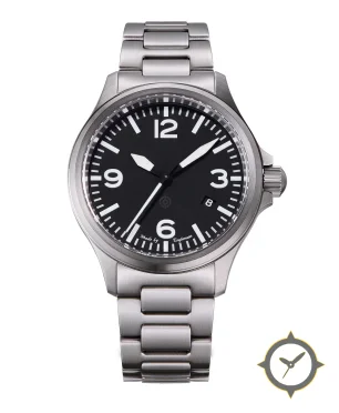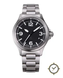 Eine Pilot-Uhr mit einem markanten 44mm Auftritt am Handgelenk, gefertigt aus Edelstahl mit einem Zifferblatt in schwarz und einer besonderen "matte"-Oberfläche.