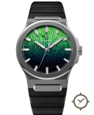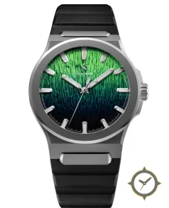 Eine Sport-Uhr mit einem 36.5mm Gehäuse im Vintage-Stil gefertigt aus Edelstahl mit einem Zifferblatt in grün und einer besonderen "textured, high-relief bark/woodgrain effect with a radial gradient finish"-Oberfläche.