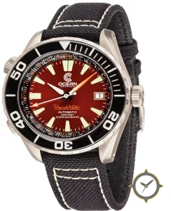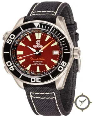 Eine Taucheruhr-Uhr mit einem 37mm Gehäuse im Vintage-Stil gefertigt aus Edelstahl mit einem Zifferblatt in rot und einer besonderen "sunburst (radial gradient)"-Oberfläche.