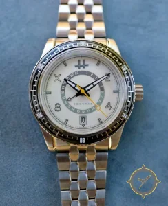 Eine GMT-Uhr mit einem vielseitigen 38.5mm Gehäuse, das an fast jedes Handgelenk passt, gefertigt aus Edelstahl mit einem Zifferblatt in türkis und einer besonderen "smooth lacquer"-Oberfläche und einer echten GMT-Funktion, mit der du eine zweite Zeitzone verfolgen kannst.