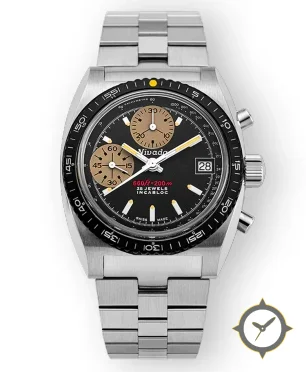 Eine Chronograph-Uhr mit einem markanten 43.5mm Auftritt am Handgelenk, gefertigt aus Edelstahl mit einem Zifferblatt in schwarz und einer besonderen "matte"-Oberfläche.