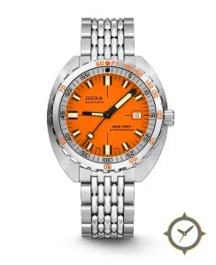 Eine Taucheruhr-Uhr mit einem vielseitigen 41mm Gehäuse, das an fast jedes Handgelenk passt, gefertigt aus Edelstahl mit einem Zifferblatt in orange und einer besonderen "matte"-Oberfläche.