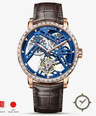 Eine Skelett-Uhr mit einem markanten 43mm Auftritt am Handgelenk, gefertigt aus Gold mit einem Zifferblatt in blau und einer besonderen "openworked / skeleton"-Oberfläche.