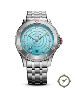 Eine Taucheruhr-Uhr mit einem vielseitigen 39mm Gehäuse, das an fast jedes Handgelenk passt, gefertigt aus Edelstahl mit einem Zifferblatt in türkis und einer besonderen "brushed concentric rings"-Oberfläche.