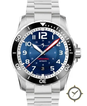 Eine Taucheruhr-Uhr mit einem markanten 46mm Auftritt am Handgelenk, gefertigt aus Edelstahl mit einem Zifferblatt in blau und einer besonderen "sunburst"-Oberfläche.