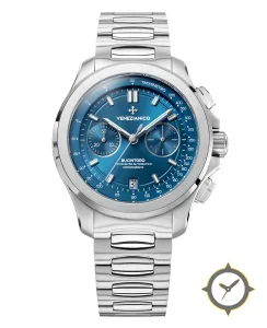 Eine Chronograph-Uhr mit einem markanten 43mm Auftritt am Handgelenk, gefertigt aus Edelstahl mit einem Zifferblatt in blau und einer besonderen "sunburst"-Oberfläche.