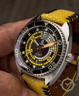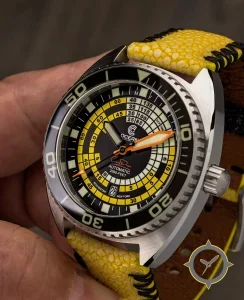 Eine Taucheruhr-Uhr mit einem markanten 44mm Auftritt am Handgelenk, gefertigt aus Edelstahl mit einem Zifferblatt in schwarz und einer besonderen "matte with concentric raised rings"-Oberfläche.
