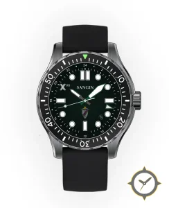 Eine Taucheruhr-Uhr mit einem 32.5mm Gehäuse im Vintage-Stil gefertigt aus Edelstahl mit einem Zifferblatt in grün und einer besonderen "matte with 24-hour inner track"-Oberfläche.