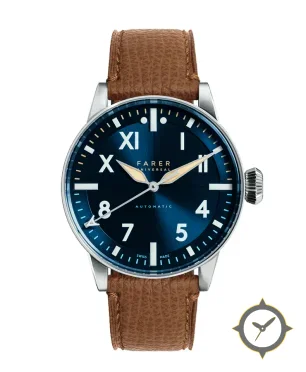 Eine Pilot-Uhr mit einem markanten 46mm Auftritt am Handgelenk, gefertigt aus Edelstahl mit einem Zifferblatt in blau und einer besonderen "radial sunburst"-Oberfläche.