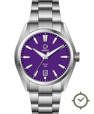 Eine Dress-Uhr mit einem markanten 45.5mm Auftritt am Handgelenk, gefertigt aus Edelstahl mit einem Zifferblatt in lila und einer besonderen "matte"-Oberfläche.