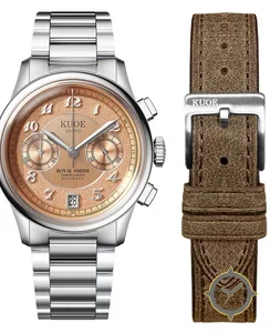 Eine Chronograph-Uhr mit einem 33mm Gehäuse im Vintage-Stil gefertigt aus Edelstahl mit einem Zifferblatt in gold und einer besonderen "grained (textured) with brushed center"-Oberfläche.