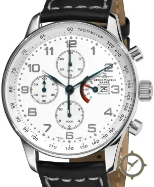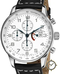 Eine Chronograph-Uhr gefertigt aus Edelstahl mit einem Zifferblatt in weiß und einer besonderen "matte white"-Oberfläche und einer praktischen Gangreserveanzeige.
