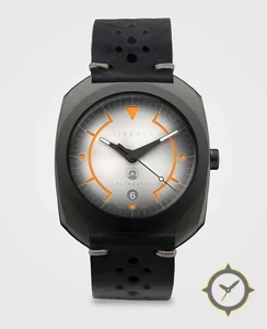 Eine Fahrer-Uhr mit einem markanten 42.5mm Auftritt am Handgelenk, gefertigt aus Edelstahl mit einem Zifferblatt in silber und einer besonderen "sunburst"-Oberfläche.