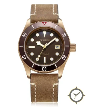 Eine Taucheruhr-Uhr mit einem markanten 43.5mm Auftritt am Handgelenk, gefertigt aus Bronze mit einem Zifferblatt in braun und einer besonderen "matte"-Oberfläche.