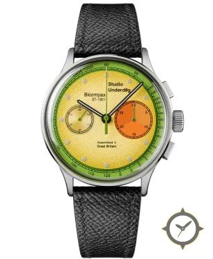 Eine Chronograph-Uhr mit einem markanten 43mm Auftritt am Handgelenk, gefertigt aus Edelstahl mit einem Zifferblatt in gelb und einer besonderen "frosted granular / sandblasted texture"-Oberfläche.