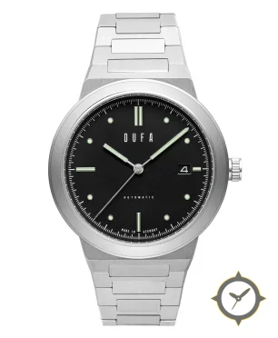 Eine Minimalistisch-Uhr mit einem markanten 48mm Auftritt am Handgelenk, gefertigt aus Edelstahl mit einem Zifferblatt in schwarz und einer besonderen "matte"-Oberfläche.