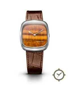 Eine Dress-Uhr mit einem 33mm Gehäuse im Vintage-Stil gefertigt aus Edelstahl mit einem Zifferblatt in braun und einer besonderen "tiger's eye stone (chatoyant)"-Oberfläche.