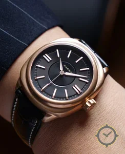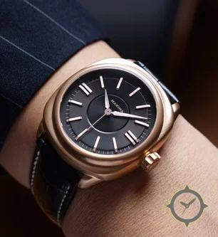 Eine Luxus-Uhr mit einem markanten 44mm Auftritt am Handgelenk, gefertigt aus Gold mit einem Zifferblatt in grau und einer besonderen "matte with recessed central sector and slightly raised chapter ring"-Oberfläche.