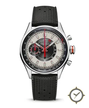 Eine Racing-Uhr mit einem markanten 41.5mm Auftritt am Handgelenk, gefertigt aus Edelstahl mit einem Zifferblatt in weiß und einer besonderen "sunburst/contrast center with matte outer sector"-Oberfläche.