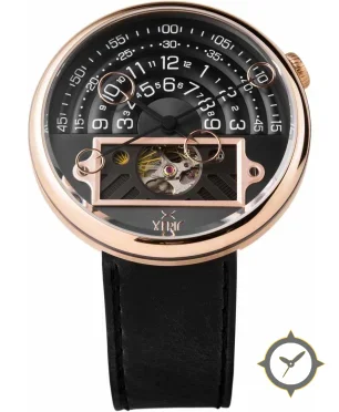 Eine Skelett-Uhr mit einem vielseitigen 40.5mm Gehäuse, das an fast jedes Handgelenk passt, gefertigt aus Gold mit einem Zifferblatt in schwarz und einer besonderen "layered concentric rings with open-heart aperture showing movement"-Oberfläche.