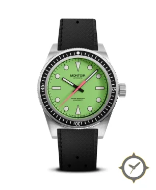 Eine Taucheruhr-Uhr mit einem markanten 42.5mm Auftritt am Handgelenk, gefertigt aus Edelstahl mit einem Zifferblatt in grün und einer besonderen "matte"-Oberfläche.