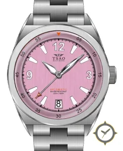 Eine Sport-Uhr mit einem 31.5mm Gehäuse im Vintage-Stil gefertigt aus Edelstahl mit einem Zifferblatt in lila und einer besonderen "brushed"-Oberfläche.
