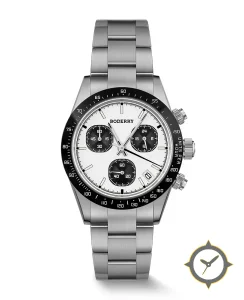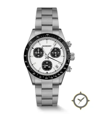 Eine Chronograph-Uhr mit einem vielseitigen 38.5mm Gehäuse, das an fast jedes Handgelenk passt, gefertigt aus Edelstahl mit einem Zifferblatt in weiß und einer besonderen "lacquer"-Oberfläche.