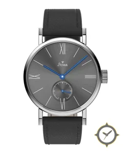 Eine Dress-Uhr mit einem 35.5mm Gehäuse im Vintage-Stil gefertigt aus Edelstahl mit einem Zifferblatt in grau und einer besonderen "sunburst"-Oberfläche.