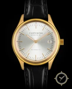 Eine Dress-Uhr mit einem 31mm Gehäuse im Vintage-Stil gefertigt aus Gold mit einem Zifferblatt in silber und einer besonderen "sunburst (radial brushed)"-Oberfläche.