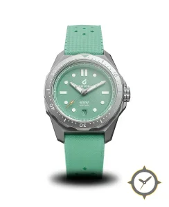 Eine Taucheruhr-Uhr mit einem markanten 47mm Auftritt am Handgelenk, gefertigt aus Edelstahl mit einem Zifferblatt in türkis und einer besonderen "grained"-Oberfläche.