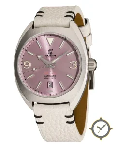 Eine Taucheruhr-Uhr gefertigt aus Edelstahl mit einem Zifferblatt in lila und einer besonderen "sunburst (radial brushed)"-Oberfläche.