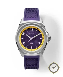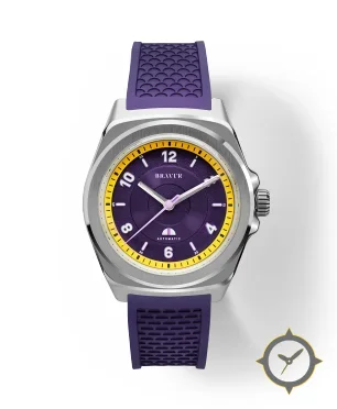 Eine Sport-Uhr gefertigt aus Edelstahl mit einem Zifferblatt in lila und einer besonderen "concentric grained texture"-Oberfläche.