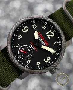 Eine Militär-Uhr mit einem markanten 48.5mm Auftritt am Handgelenk, gefertigt aus Titan mit einem Zifferblatt in schwarz und einer besonderen "matte"-Oberfläche.