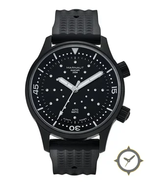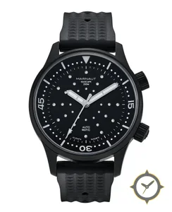 Eine Taucheruhr-Uhr mit einem markanten 44mm Auftritt am Handgelenk, gefertigt aus Edelstahl mit einem Zifferblatt in schwarz und einer besonderen "matte"-Oberfläche.