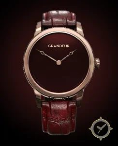 Eine Dress-Uhr gefertigt aus Gold mit einem Zifferblatt in karmesinrot und einer besonderen "glossy lacquer"-Oberfläche.