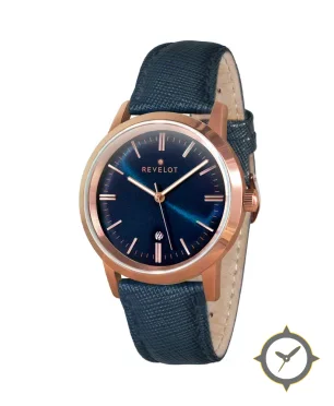 Eine Dress-Uhr mit einem 29mm Gehäuse im Vintage-Stil gefertigt aus Edelstahl mit einem Zifferblatt in marineblau und einer besonderen "sunburst"-Oberfläche.