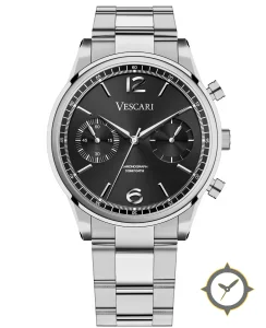 Eine Chronograph-Uhr mit einem markanten 48mm Auftritt am Handgelenk, gefertigt aus Edelstahl mit einem Zifferblatt in schwarz und einer besonderen "sunburst / subtle radial gradient"-Oberfläche.