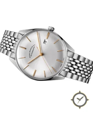 Eine Dress-Uhr mit einem markanten 44.5mm Auftritt am Handgelenk, gefertigt aus Edelstahl mit einem Zifferblatt in silber und einer besonderen "sunburst"-Oberfläche.