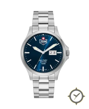 Eine Militär-Uhr mit einem markanten 48.5mm Auftritt am Handgelenk, gefertigt aus Edelstahl mit einem Zifferblatt in blau und einer besonderen "sunburst/metallic"-Oberfläche.