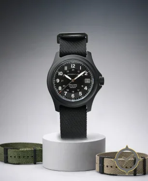Eine Field-Uhr mit einem markanten 43mm Auftritt am Handgelenk, gefertigt aus Edelstahl mit einem Zifferblatt in schwarz und einer besonderen "matte"-Oberfläche.