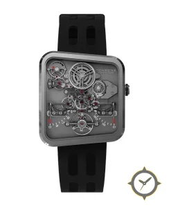 Eine Skelett-Uhr mit einem 35mm Gehäuse im Vintage-Stil gefertigt aus Titan mit einem Zifferblatt in grau und einer besonderen "openworked/skeleton with brushed metal finish"-Oberfläche und einer praktischen Gangreserveanzeige.