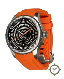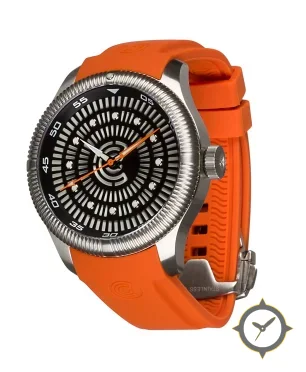 Eine Taucheruhr-Uhr mit einem vielseitigen 40mm Gehäuse, das an fast jedes Handgelenk passt, gefertigt aus Edelstahl mit einem Zifferblatt in schwarz und einer besonderen "radial concentric cutout pattern (textured with raised rings)"-Oberfläche.