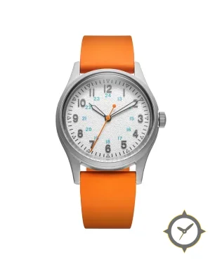 Eine Field-Uhr mit einem 34.5mm Gehäuse im Vintage-Stil gefertigt aus Edelstahl mit einem Zifferblatt in weiß und einer besonderen "grained"-Oberfläche.